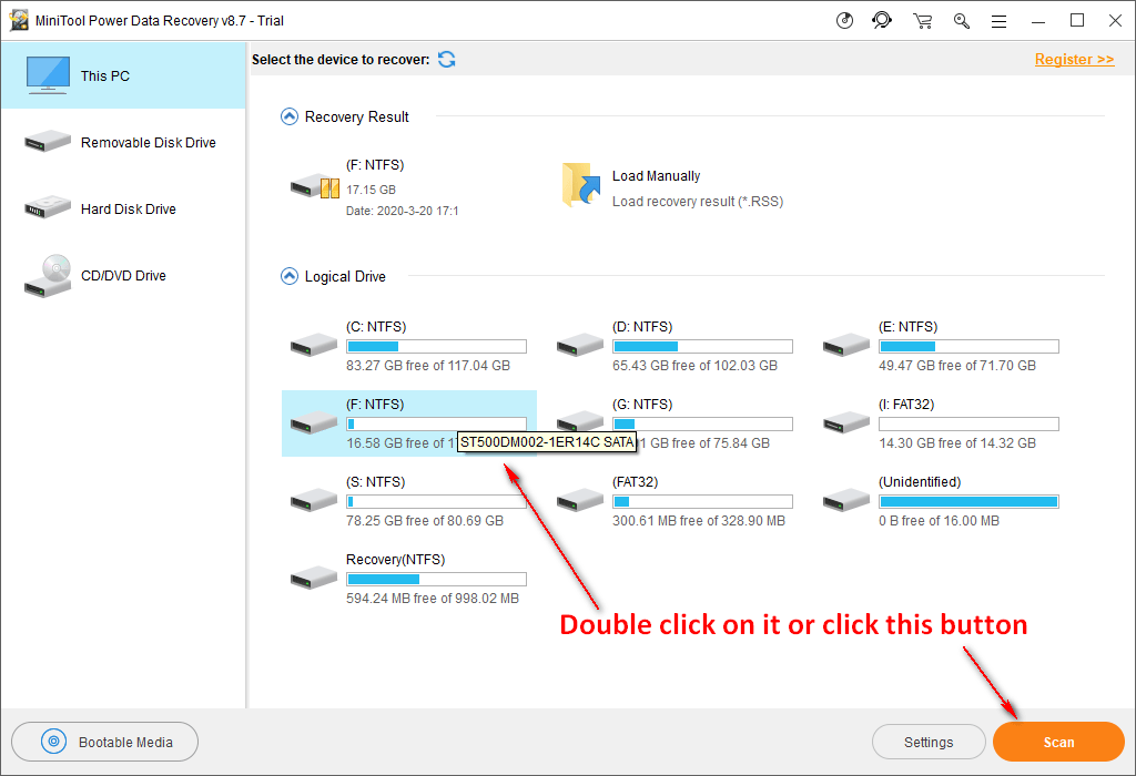 Шаг 4 : дважды щелкните диск или щелкните значок Сканировать кнопку, чтобы начать полное сканирование.