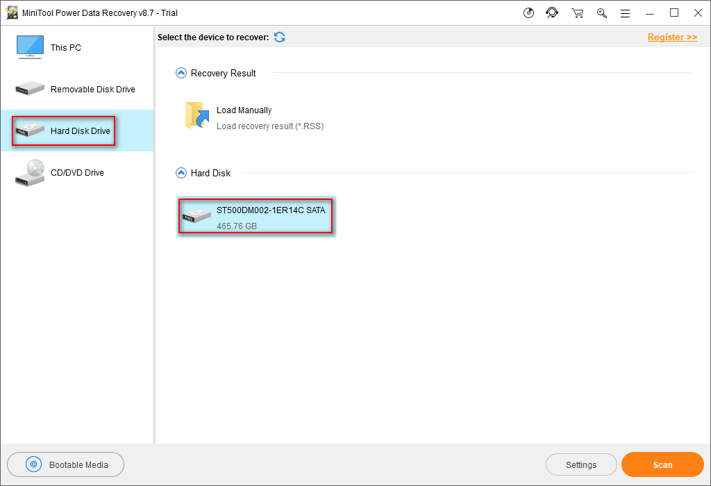 Если вы хотите просканировать весь диск, вы должны выбрать Накопитель на жестком диске и дважды щелкните жесткий диск для сканирования. Затем завершите остальные шаги, упомянутые выше.