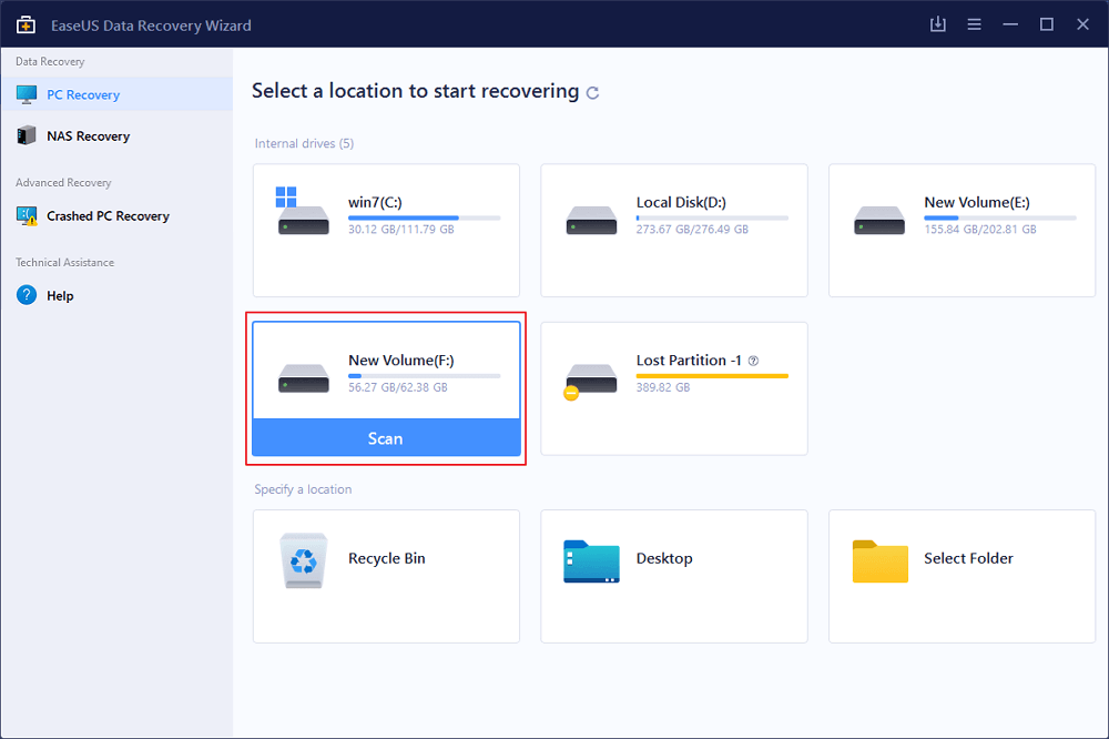Launch EaseUS Data Recovery Wizard and choose the partition where you lost data. Then, click «Scan».
