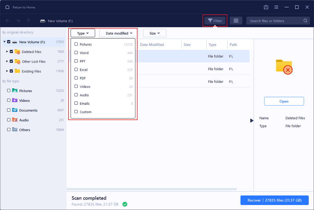 Use the file format filter on the left or upper right corner to find the files you need. Then, you can click the «Preview» button or double-click a file to preview its content.