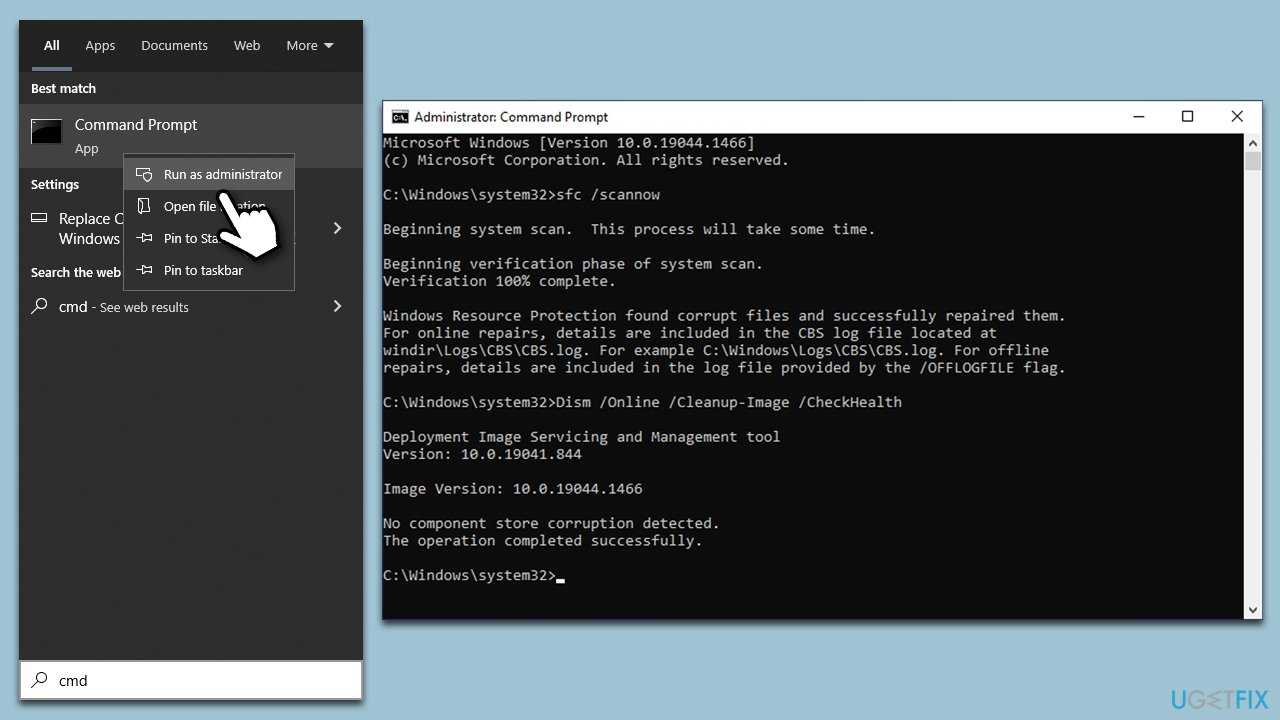 n your search window, search for ‘cmd’. Select the result and run as administrator. In separate prompts, enter the commands below: