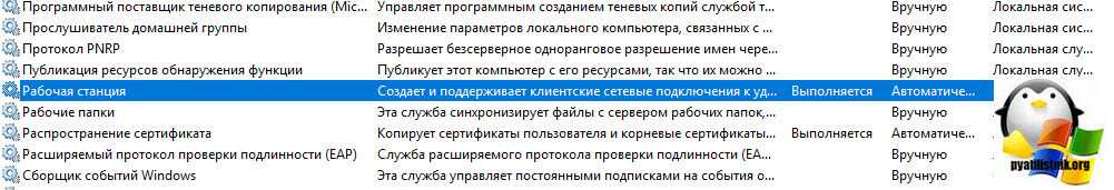 Закрываем данное окно и в списке сервисов, ищем нужную нам зависимую, напоминаю у меня, это сервис «Рабочая станция». У меня как видите она оказалась запущенной, если у вас зависимая служба выключена, то пробуйте ее запустить и когда она заработает, пробуйте стартануть основную.