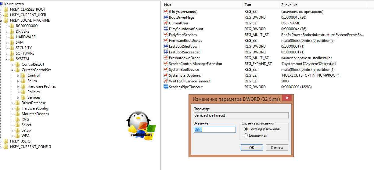 Тут необходимо создать параметр DWORD32 с именем ServicesPipeTimeout и дать ему числовое значение в секундах,