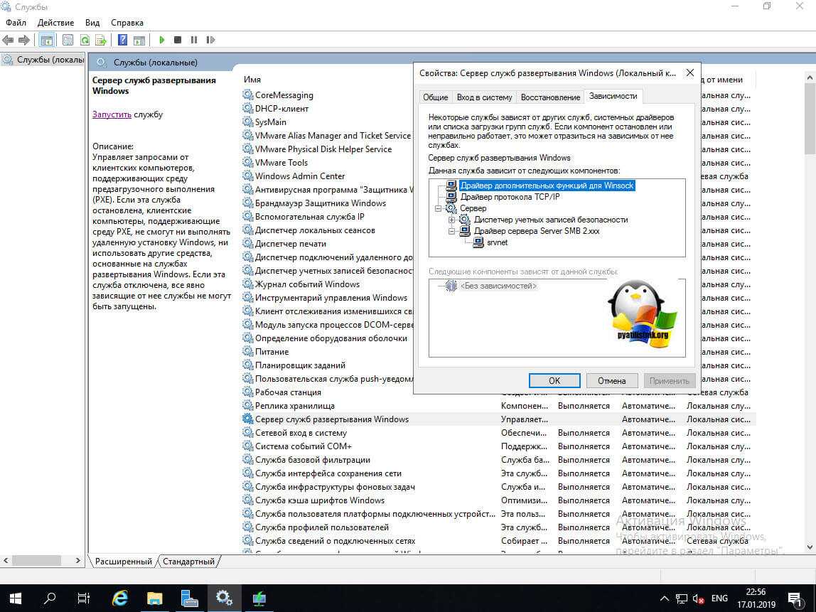 Видим, что получили все тужу ошибку, не отчаиваемся, так как все только начинается. Через то же контекстное меню, выбираем пункт «Свойства». Тут ситуация может быть такой. Некоторые сервисы, вот хоть убей но не могут функционировать без других, и вот пока другие не запущены, они так же будут простаивать, и в следствии этого вы можете видеть сообщение с кодом 1053. Такая связка называется зависимость. Посмотреть есть она у вашей сбойной службы или нет, можно на соответствующей вкладке «Зависимости». В моем случае, чтобы работала утилита Vmware vCenter Converter Standalone, нужно чтобы работал сервис «Рабочая станция», который как видите состоит из трех компонентов.