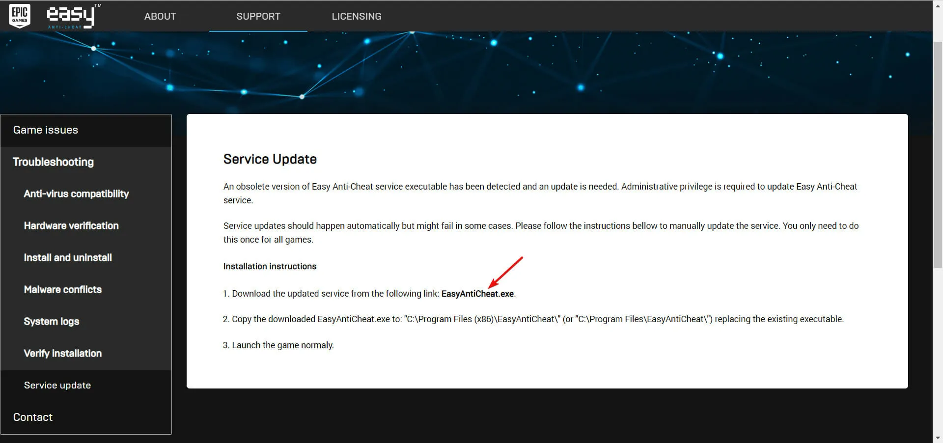 Наиболее распространенное решение — убедиться, что исполняемый системный файл EasyAntiCheat находится там, где он должен быть.