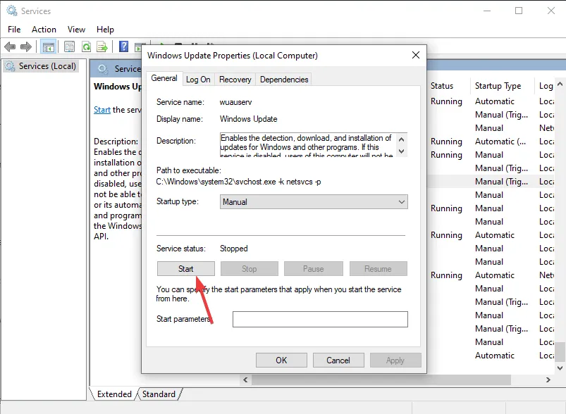 После этого выберите «Пуск», чтобы запустить службу.
