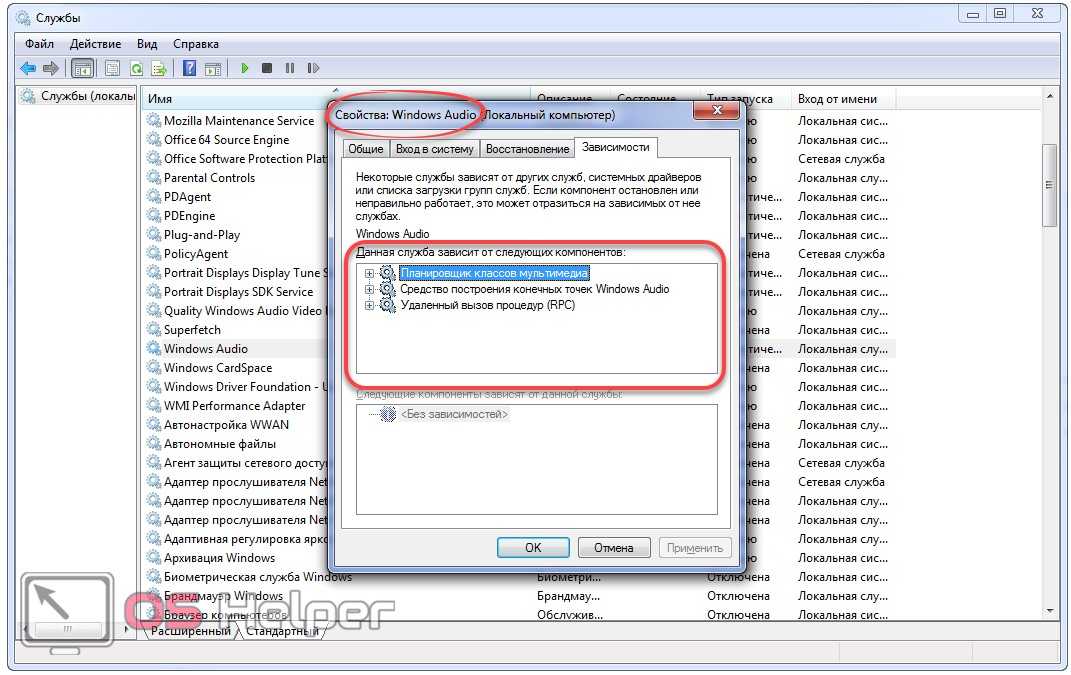 Здесь проблема кроется в иерархии сервисов на компьютере, их зависимости между собой. В свойствах любого элемента описаны его зависимости на одноимённой вкладке. В нашем случае «Windows Audio» зависит от работы срезу трёх компонентов операционной системы (смотрите скриншот ниже). От неё же не зависит функционирование никакого объекта.