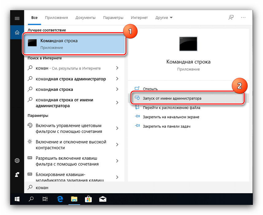 - Вызовите меню «Пуск» или поисковую строку, где введите , затем в правой части окна выберите пункт «Запуск от имени администратора».
