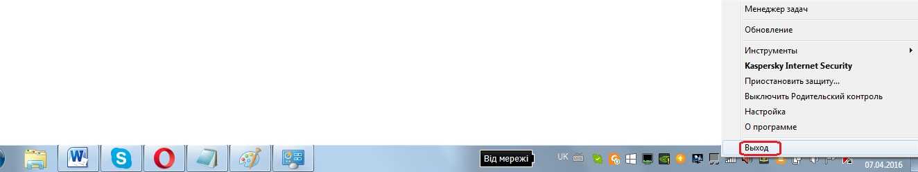 Но практически в любом антивирусе есть функция выхода, которая появляется при нажатии на пиктограмму антивируса в панели быстрого запуска. Вот так это выглядит для Касперского.