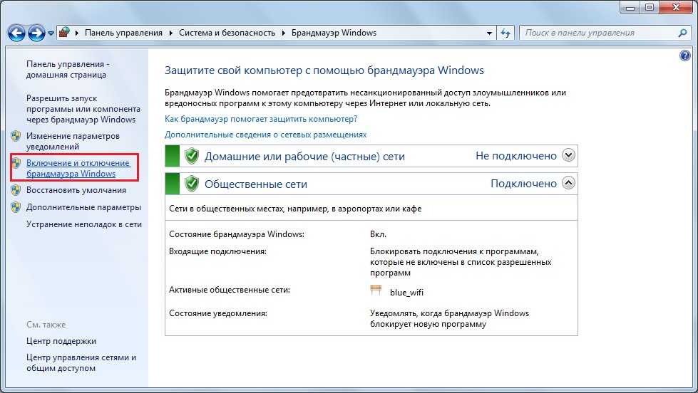 Пункт «Включение и отключение брандмауэра Windows» в окне брандмауэра