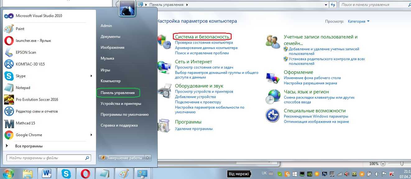 Зайти в меню «Пуск», затем выбрать «Панель управления» (на рисунке №7 выделена зеленой рамкой). После этого перейти в пункт «Система и безопасность».