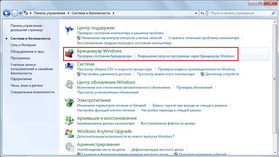 Пункт «Брандмауэр Windows» в меню «Система и безопасность»