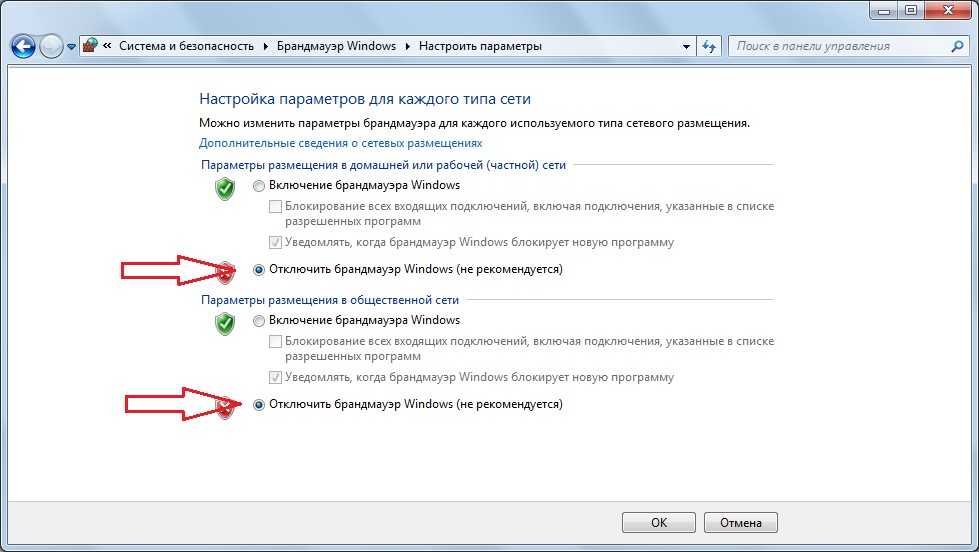 Поставить галочки напротив надписей «Отключить брандмауэр Windows».