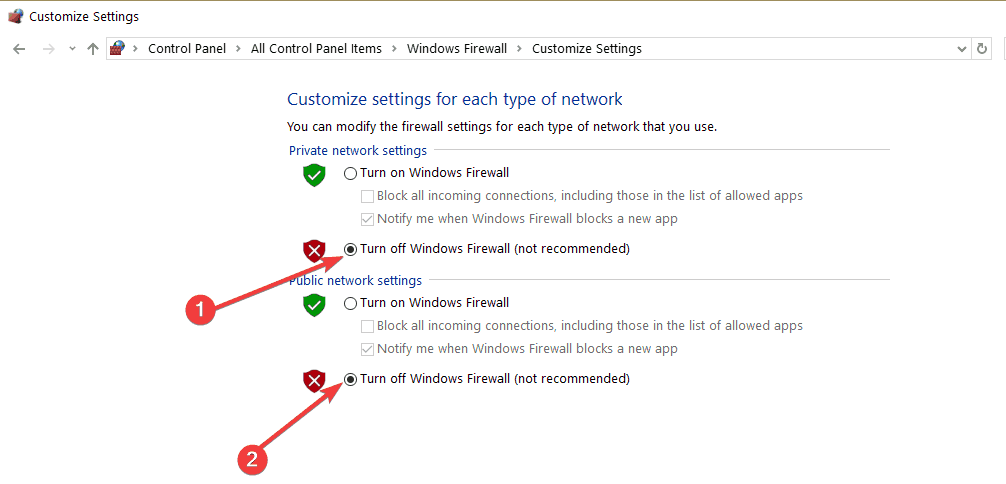 - Click both the Turn off Windows Defender Firewall radio buttons to switch off WDF.