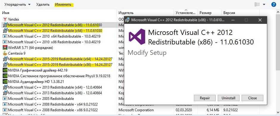 Для начало откройте «удаление программ» нажав Win+R и введя appwiz.cpl или зайдите через панель управления. Посмотрите свои версии Visual C++ Redistributable, которые должны быть установлены по две разрядности (x86) и (x64). Также, выделите нажатием мыши Visual C++ Redistributable и нажмите сверху «Изменить«, после чего в новом окне нажать на Repair (Исправить), чтобы восстановить компонент по умолчанию и исправить ошибки установщика. Если не знаете какой, то проделайте исправление со всеми.