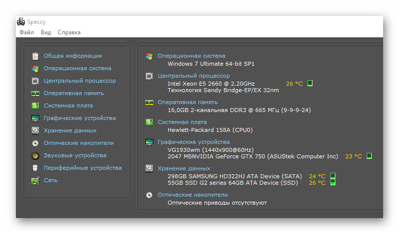 Если в вашей системе происходит перегрев какой-либо детали, то это также может стать причиной возникновения ошибки. Чтобы посмотреть температуру комплектующих, воспользуемся программой Speccy.
