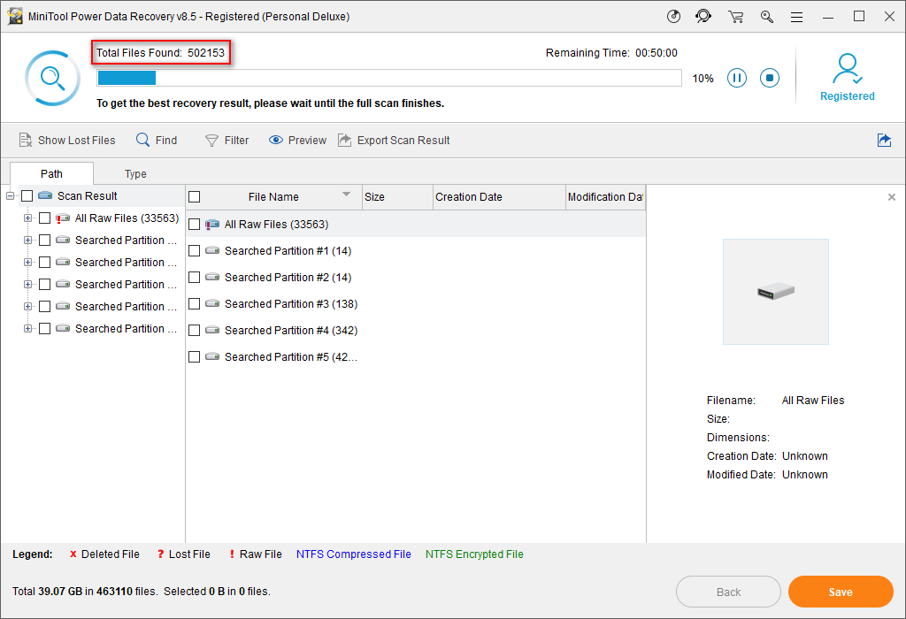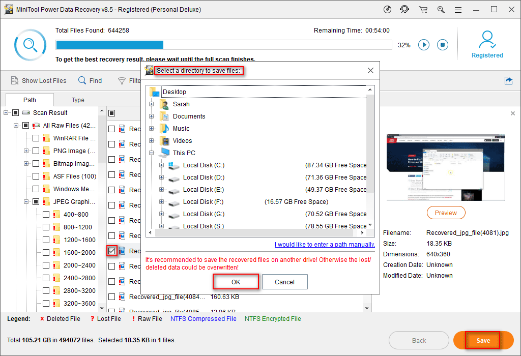 - Если вы можете найти файлы, которые хотите восстановить, выберите их и нажмите Сохранить Если здесь не все файлы, которые вам нужны, дождитесь завершения сканирования, затем выберите файлы и нажмите кнопку Сохранить кнопка.