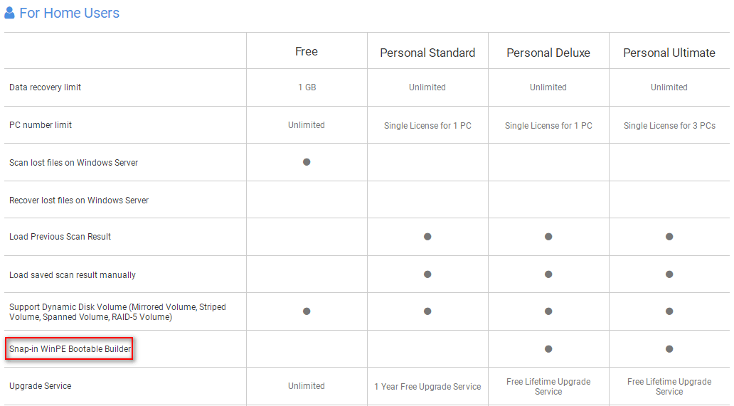 - Найдите другой компьютер, который хорошо работает, и получить подходящая версия MiniTool Power Data Recovery . Чтобы создать загрузочный диск для восстановления данных с жесткого диска без ОС, вы должны выбрать лицензию, содержащую Snap-in WinPE Bootable Builder (я советую Личный Делюкс лицензия, если у вас нет особых потребностей).
