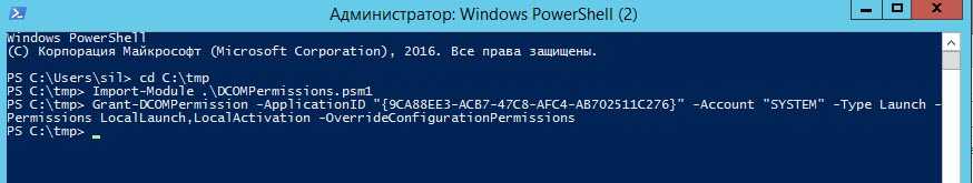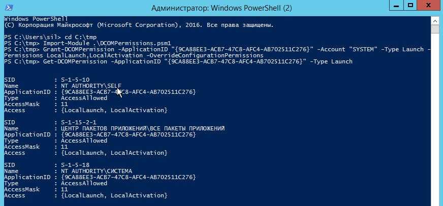 Grant-DCOMPermission -ApplicationID «{9CA88EE3-ACB7-47C8-AFC4-AB702511C276}» -Account «SYSTEM» -Type Launch -Permissions LocalLaunch,LocalActivation -OverrideConfigurationPermissions