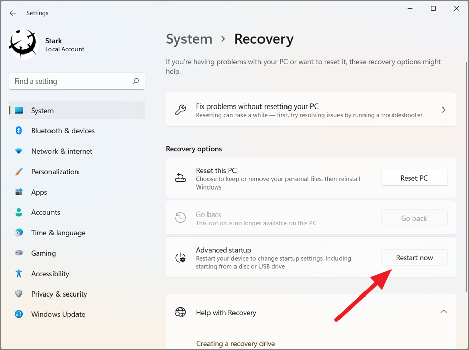 На странице настроек восстановления выберите параметр «Перезагрузить сейчас» рядом с «Расширенный запуск».