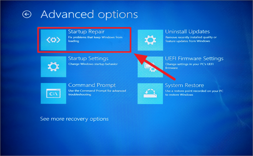 Теперь выберите параметр «Восстановление при загрузке», как показано ниже.