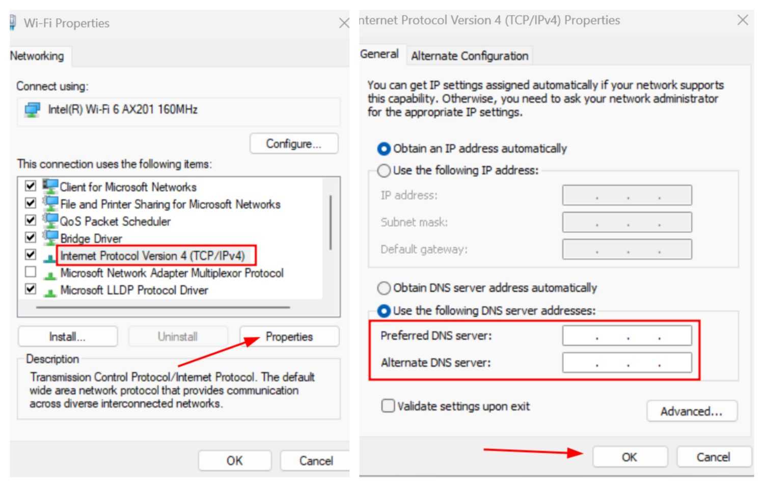 Enter the public DNS server address and click OK. This was for IPv4, and you can repeat the steps for IPv6, sitting further down in the list.