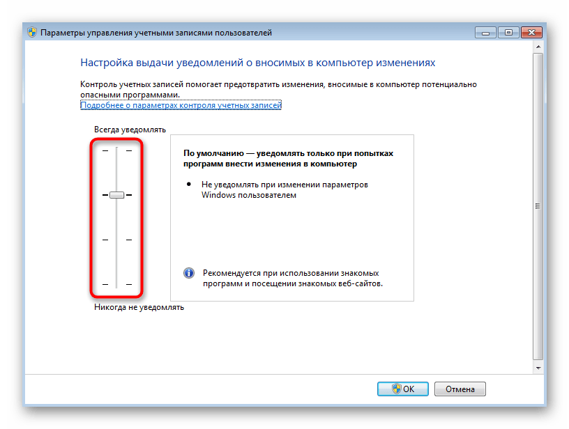 Еще одна причина, по которой возникают ошибки с установкой разных программ. По умолчанию в Windows 7 установлены параметры контроля учетных записей, уведомляющие администратора о внесении любых изменений в систему, что касается и инсталляции софта. Если отключить подобные уведомления, проблема с файловой системой должна исчезнуть.