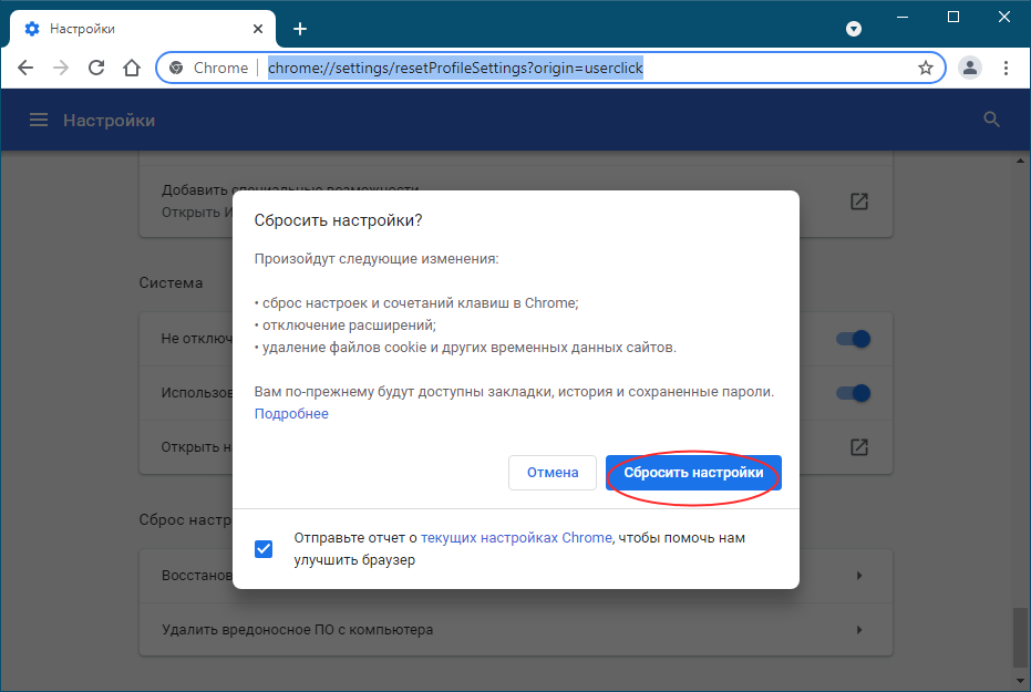 Сброс конфигурации обозревателя — относительно жёсткий способ исправления проблем с браузером, при этом отключаются расширения, удаляются все временные файлы и сбрасываются настройки домашней страницы. Чтобы выполнить сброс в Chrome, переходим в браузере по адресу chrome://settings/resetProfileSettings?origin=userclick, для сброса параметров Edge заходим на страницу edge://settings/resetProfileSettings и жмём кнопку сброса.