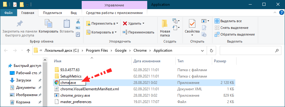 - Измените имя файла с «Chrome.exe» на «Chrome1.exe».