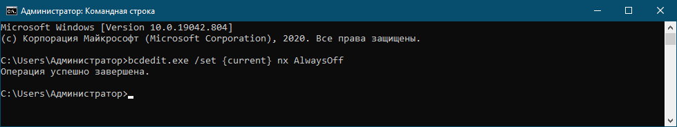 К сожалению, данный способ не подходит для Chrome и Edge, но с некоторой долей риска вы можете отключить предотвращение выполнения данных глобально, выполнив в запущенной от имени администратора командной строке команду bcdedit.exe /set nx AlwaysOff. Соответственно, чтобы включить DEP, параметр AlwaysOff нужно заменить на AlwaysOn.
