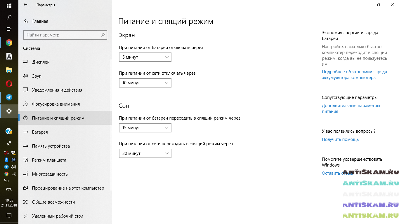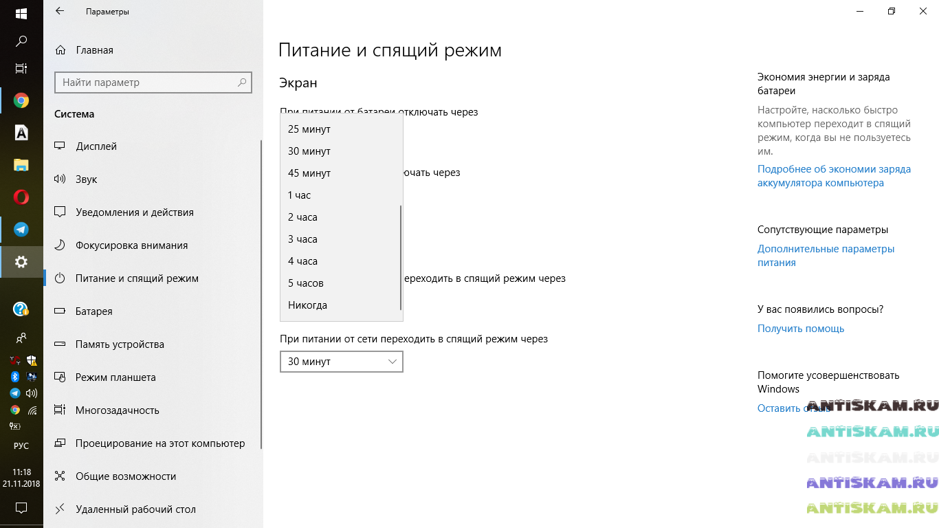 Так, если вы являетесь владельцем ноутбука, то щелкните правой кнопкой мыши по значку батареи, который располагается в правом нижнем углу дисплея. Выбрав пункт «Электропитание», вы увидите список параметров, которые были доступны в Панели управления. То есть можно будет отдельно настроить отключение в зависимости от того, как работает ноутбук (от сети или от встроенного аккумулятора).