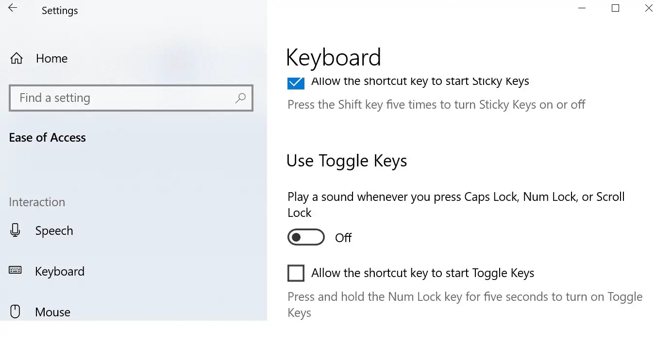 Есть и другие варианты, похожие на Ключи фильтра, липкие и тумблеры. Есть определенные сочетания клавиш на клавиатуре, и если вы нажимаете клавиши определенным образом, она активирует один из этих параметров, а затем вызывает проблемы, такие как шум щелчка и не писать.