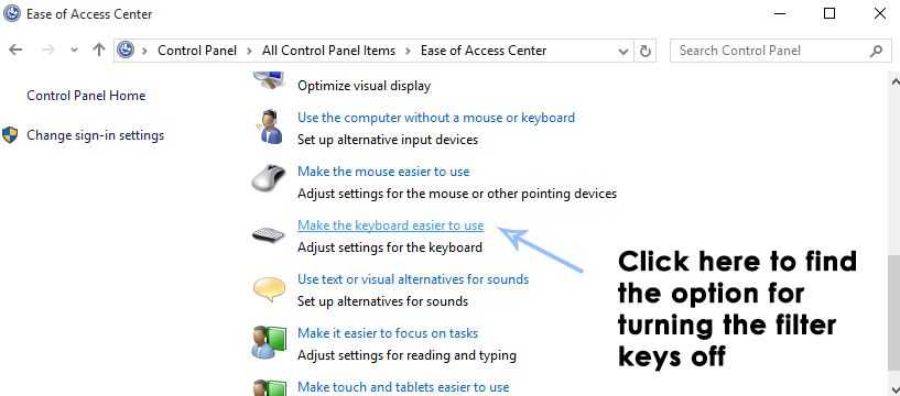 4. Внутри Центр Простоты Доступа прокрутите вниз, чтобы найти опцию, помеченную как Сделайте клавиатуру проще в использовании. Нажмите на него, чтобы найти способ отключить фильтр ключей.