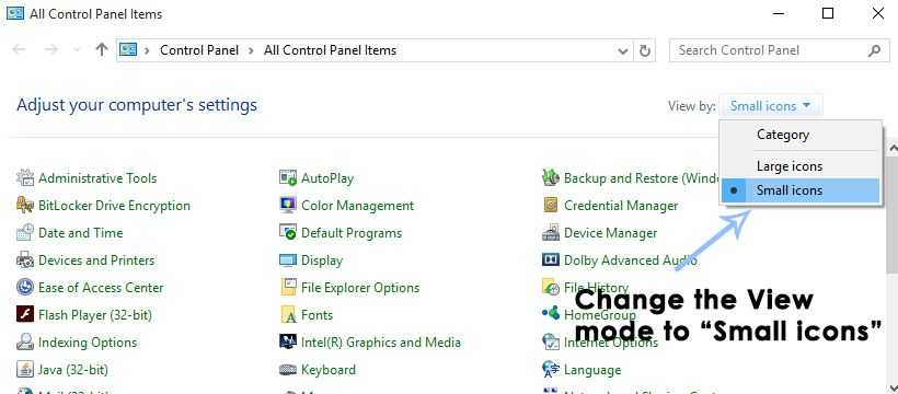 2. Измените вид на Маленькие иконки расположен в правом верхнем углу окна панели управления. Это просто для целей доступности.