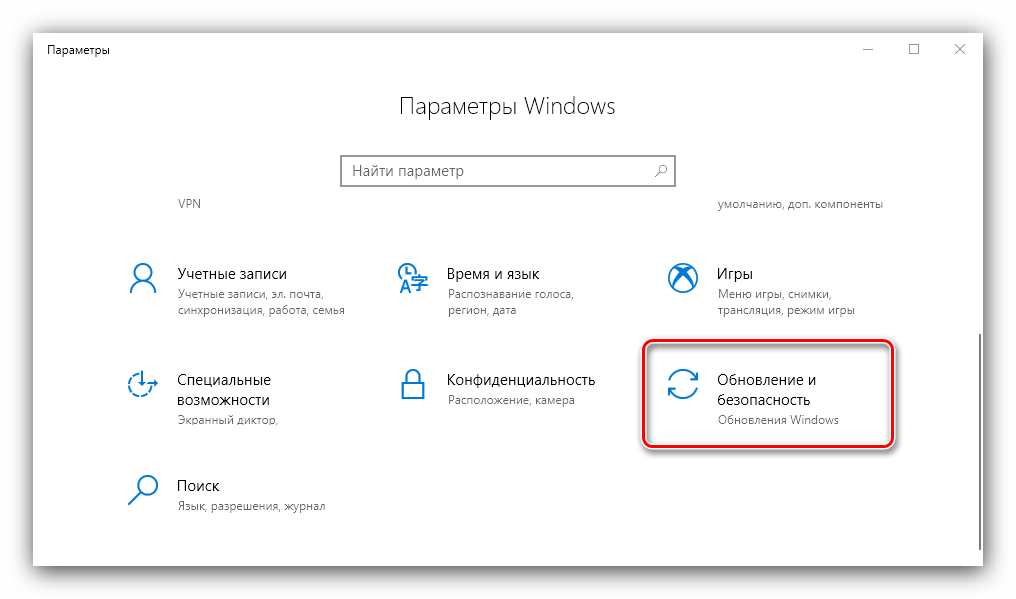 - Вызовите «Параметры» с помощью клавиш Win+I, затем перейдите в раздел «Обновления и безопасность».