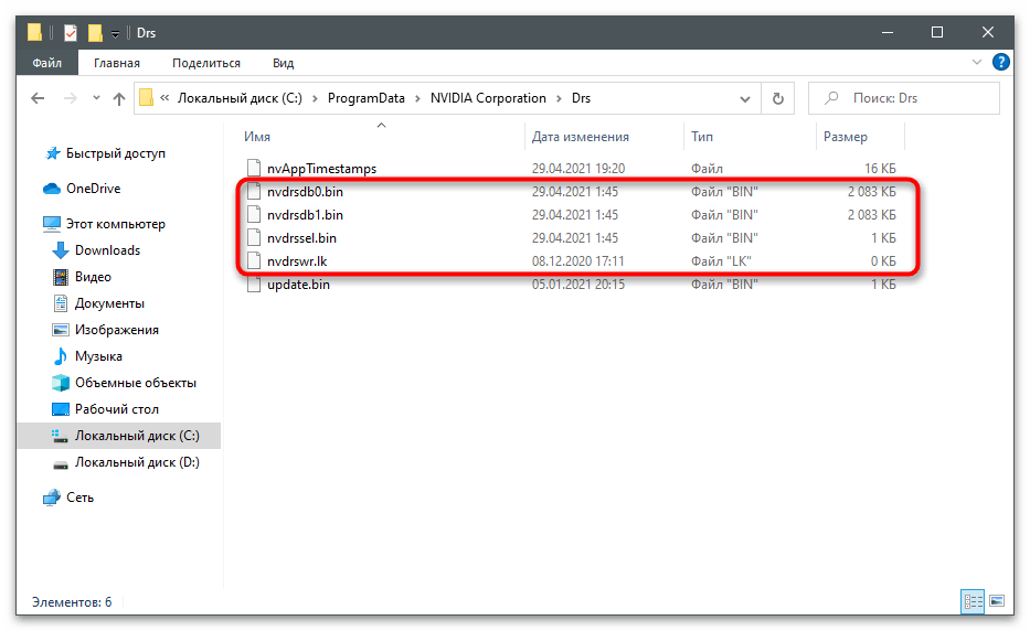 - Если это не помогло, откройте папку Drs, выберите в ней файлы, имена которых начинаются с nvdrs и имеют расширение .bin. Переместите эти файлы в другое расположение (не торопитесь удалять), а затем перезагрузите компьютер.
