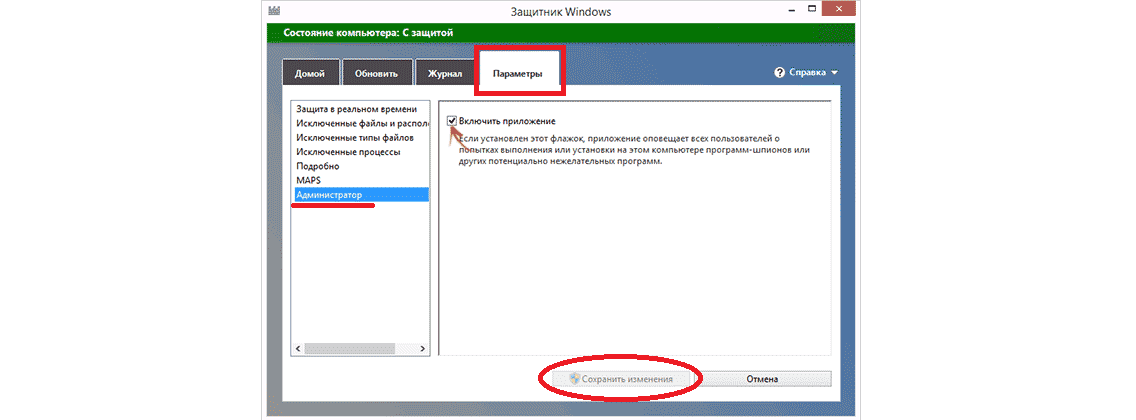 В Windows 8.1 процедура выглядит практически также, только в самом окне защитника необходимо перейти на вкладку «Параметры» сверху, затем – в раздел «Администратор» слева и убрать галочку с пункта «Включить приложение».