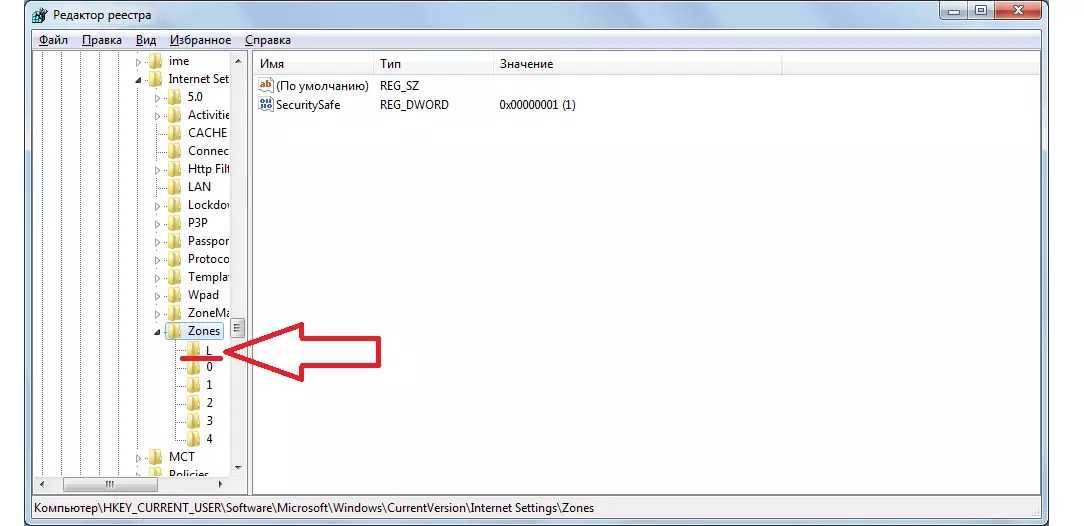 - Там последовательно нужно перейти в такие папки: «HKEY_CURRENT_USER», «Software», «Microsoft», затем «Windows», «CurrentVersion», «Internet Settings» и, наконец, «Zones». Делается это в панели слева.