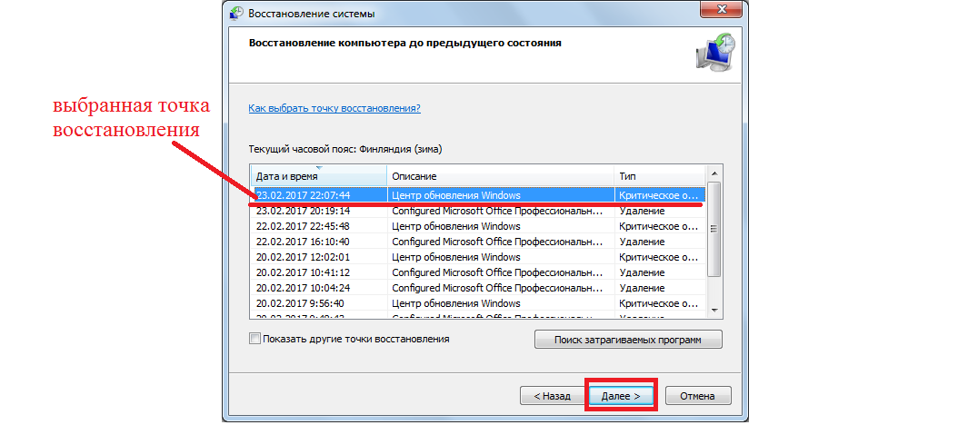 - Дальше откроется окно выбора точки восстановления. Нажмите на ту, которая наиболее соответствует времени, когда файлы открывались безо всяких проблем. Нажмите «Далее», а в следующем окне – «Готово».