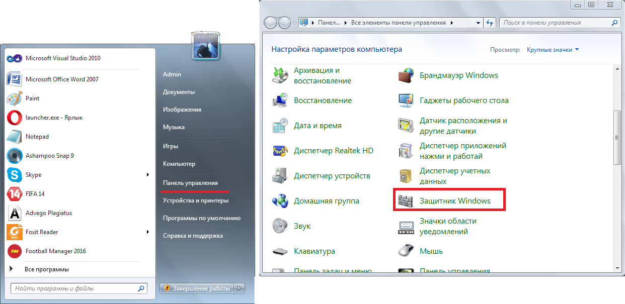 - Открываем «Панель управления» (через меню «Пуск») и запускаем программу «Защитник Windows».