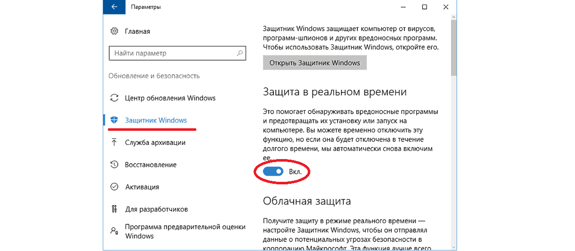 Внимание! В Windows 10 защита отключается всего лишь на 15 минут. После этого она включается снова