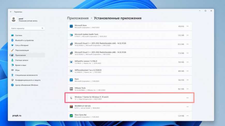 Чтобы удалить приложение перейдите в Параметры → Приложения → Установленные приложения, нажмите три точки возле Windows 7 Games for Windows 11, 10 and 8 и выберите «Удалить».