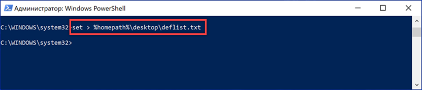 Чтобы сразу сохранить информацию в текстовый файл модифицируем вводимую команду. Набираем «set > %homepath%\desktop\deflist.txt». Нажав клавишу Enter, получаем на рабочем столе файл с именем «deflist», которые открывается в Блокноте. В приведенном примере используется одна из переменных сред системы – %homepath%, указывающая прямой путь к директории текущего пользователя.