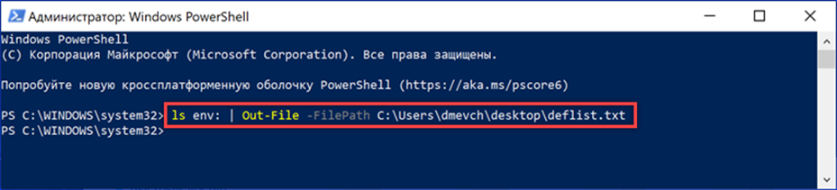 На следующем скриншоте показан модифицированный вариант команды, отправляющий информацию сразу в текстовый файл. В строке приглашении вводим: «ls env: | Out-File -FilePath C:\Users\Userlogin\desktop\filename.txt». Заменяем в приведенном примере Userlogin именем пользователя, под которым вошли в систему.