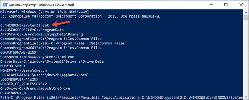 Для вывода списка переменных сред в окно интерпретатора набираем в строке-приглашении «set». Удобство PowerShell заключается в том, что полученные данные можно выделить мышкой и скопировать в Блокнот стандартным системным сочетанием «Ctrl+C». После этого можно изучать полученные данные закрыв ненужную больше командную строку.