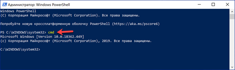 Новый интерпретатор продвигаемый Microsoft использует другой синтаксис команд. Чтобы использовать старые переведем его в режим эмуляции. Набираем в строке-приглашении «cmd» как показано на снимке экрана. Нажав на клавишу Enter, активируем в PowerShell командную строку, сохраняя при этом административные привилегии.
