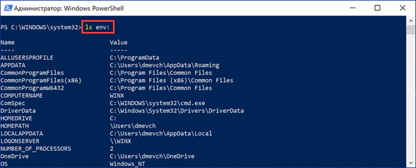Аналогичный результат, но в более структурированном виде, получаем при использовании PowerShell в обычном режиме, без эмуляции интерпретатора CMD. Набираем в строке-приглашении «ls env:».