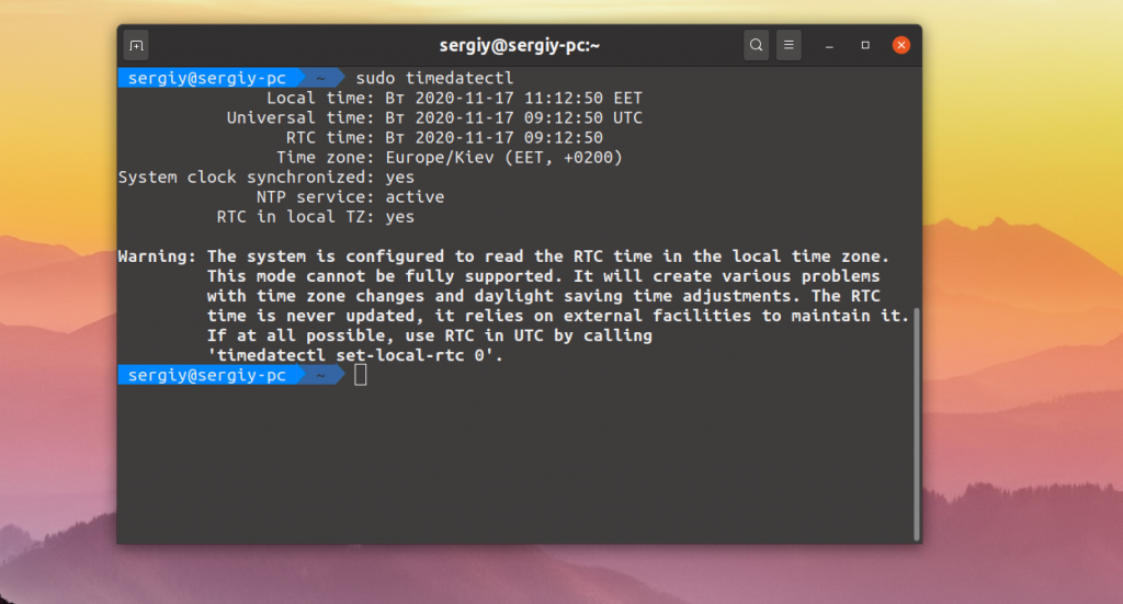 Готово, теперь вы можете перезапустить компьютер и запустить Windows, чтобы убедиться, что время не сбивается при перезагрузке. В более старых системах Ubuntu, вам нужно отредактировать файл /etc/default/rcS и заменить UTC=yes на UTC=no. Вы можете сделать это командой: