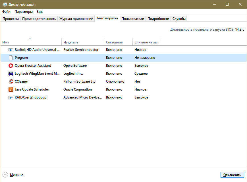 - В диспетчере, который можно открыть через вкладку автозагрузки, деактивируйте все доступные пункты.