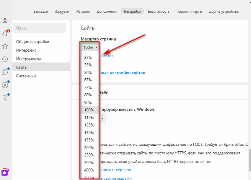 В правой части верхнего угла яндекса появится опция. Если навести курсор с помощью мышки, то появится слово «Масштаб». Это свидетельствует о том, что система запрашивает выбор определенного размера. В ниспадающем меню появится размер, который указывается в процентах. Выбрав соответствующий масштаб, можно сохранить необходимый размер.